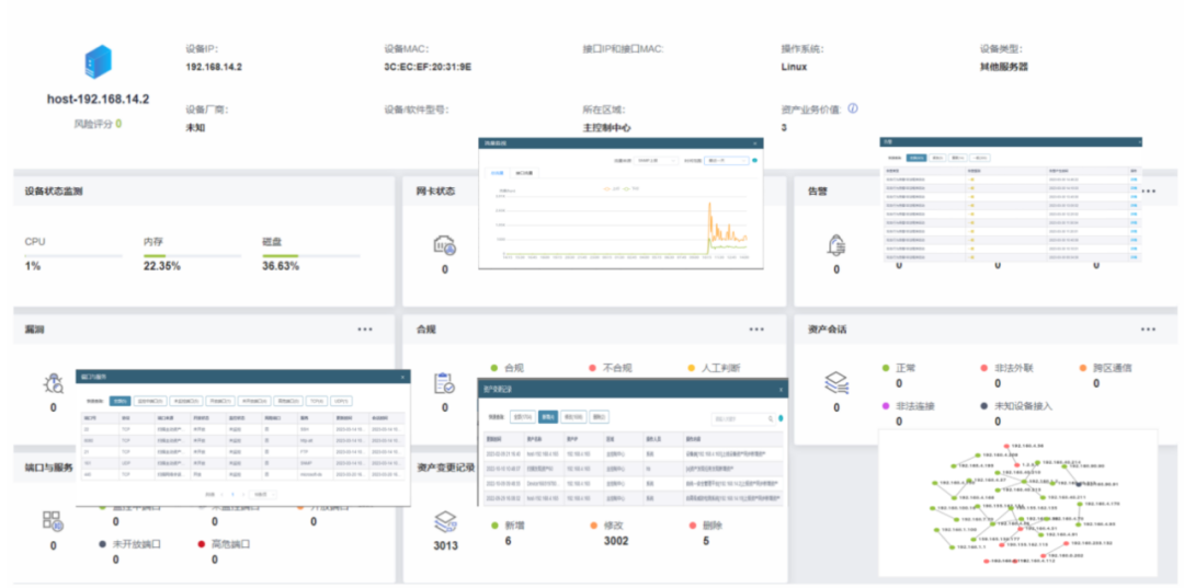 USM还为每一个资产绘制了详细的资产画像,从多维度描述了资产的信息和状态,包括基本信息、风险评分、漏洞信息、端口信息、通信信息、告警信息、变更记录等,使得用户能够全面、直观地了解资产的安全状况和运行状态。