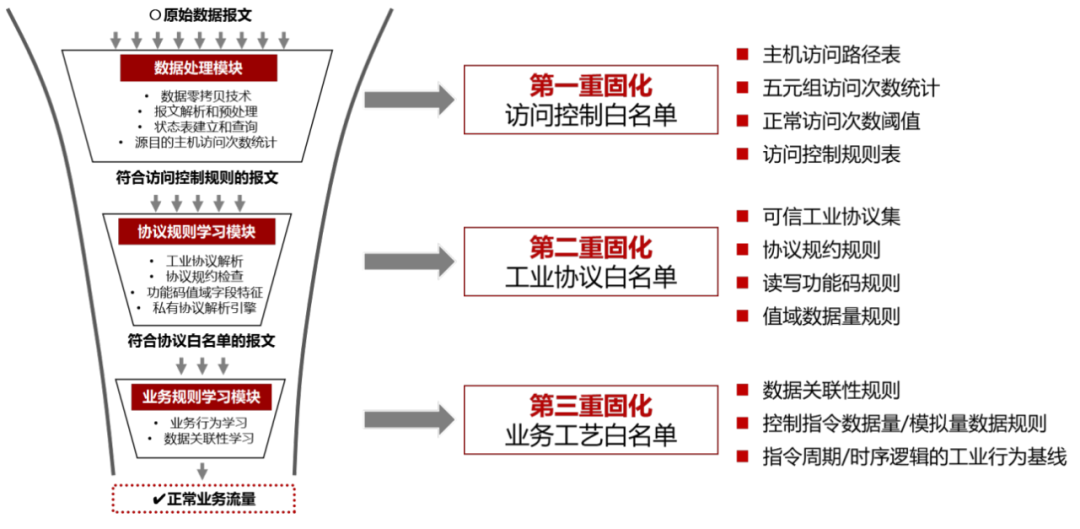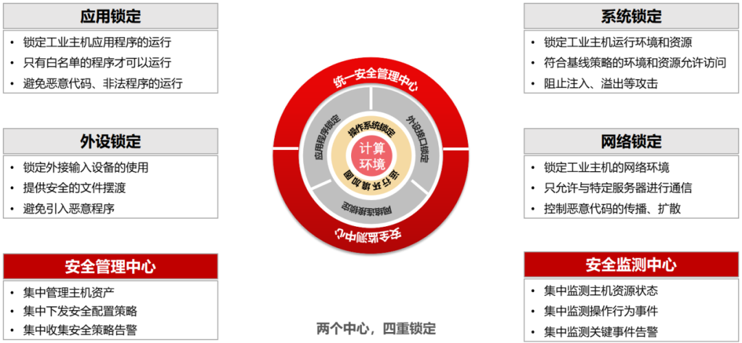通过对工业控制系统工业主机应用程序、工业控制网络、工业控制指令以及业务行为逻辑四个方面的白名单固化,构建可信任的数采通信及工控网络区域间通信的模型,形成工业控制系统可信白环境,过滤一切非法应用程序、网络访问、工控指令和业务控制行为,确保只有可信任程序可以在主机上运行,只有可信任的流量可以在网络上传输,只有可信任的工控指令和业务工艺可以在控制系统上实现,为控制主机的稳定运行、控制网与管理信息网的连接、控制网内部各区域的连接提供安全保障。
