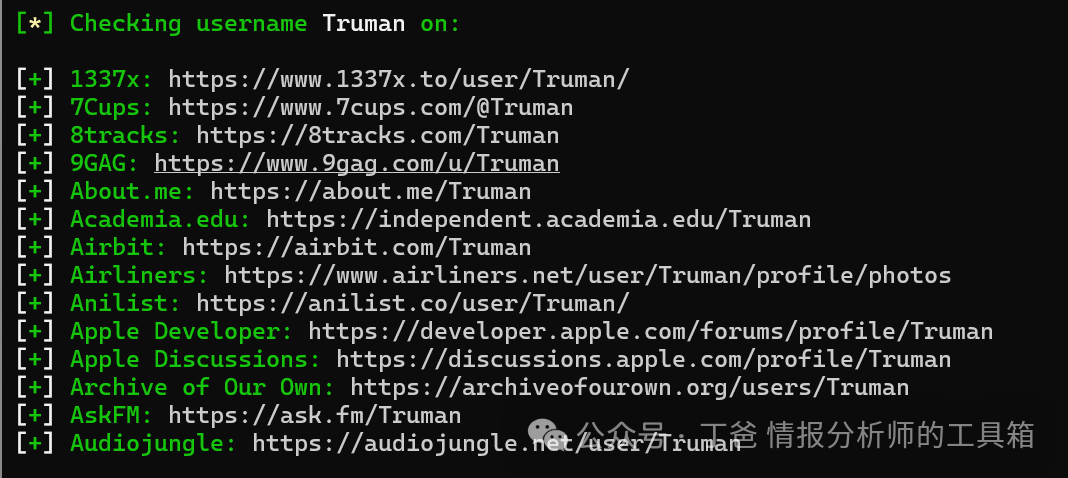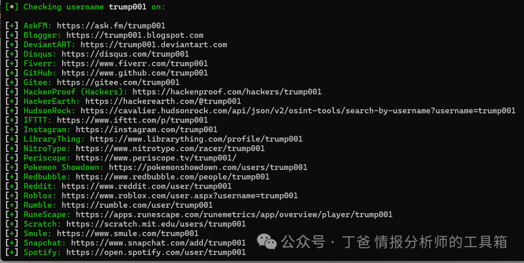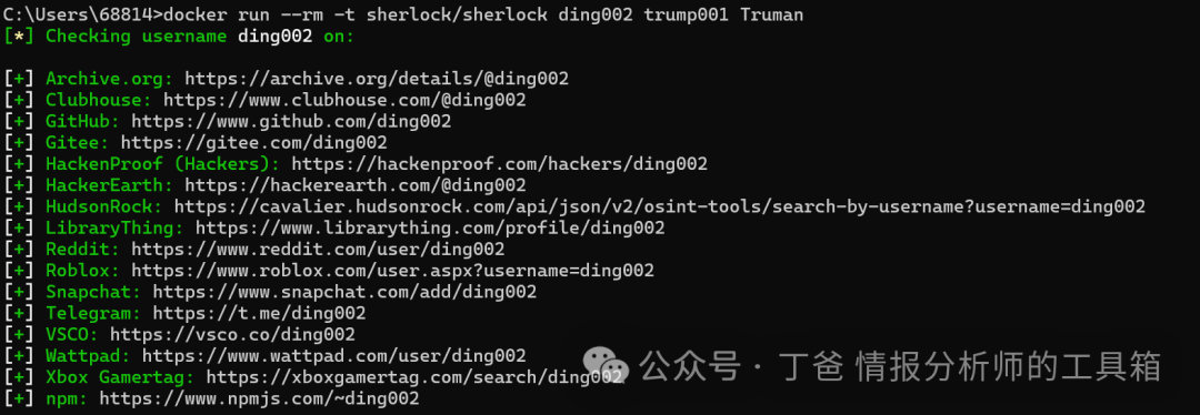 该工具也支持同时查询多个用户名,只需要将不同的用户名添加在要查询的用户名后面,比如:docker run --rm -t sherlock/sherlock ding002 trump001 Truman