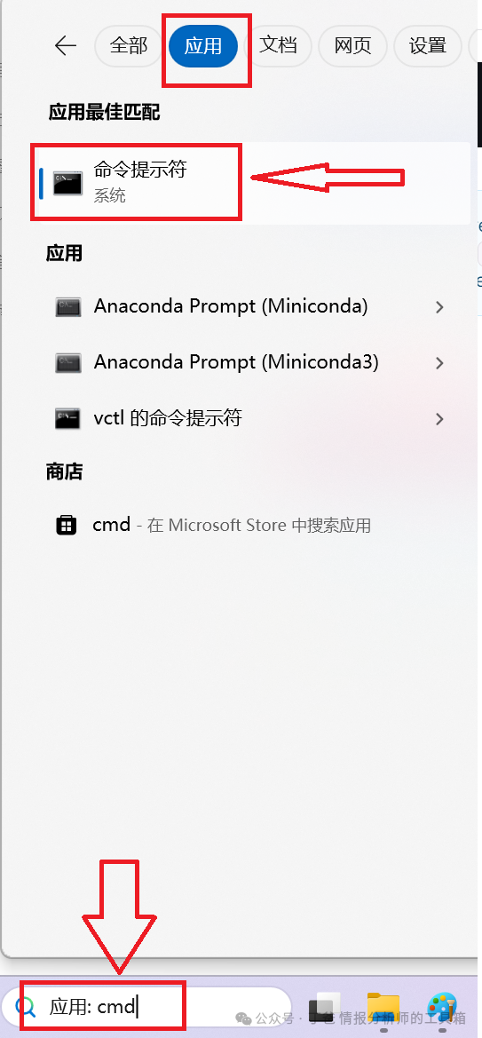 首先在电脑左下角搜索框输入“cmd"查找“应用”启动“命令提示符”: