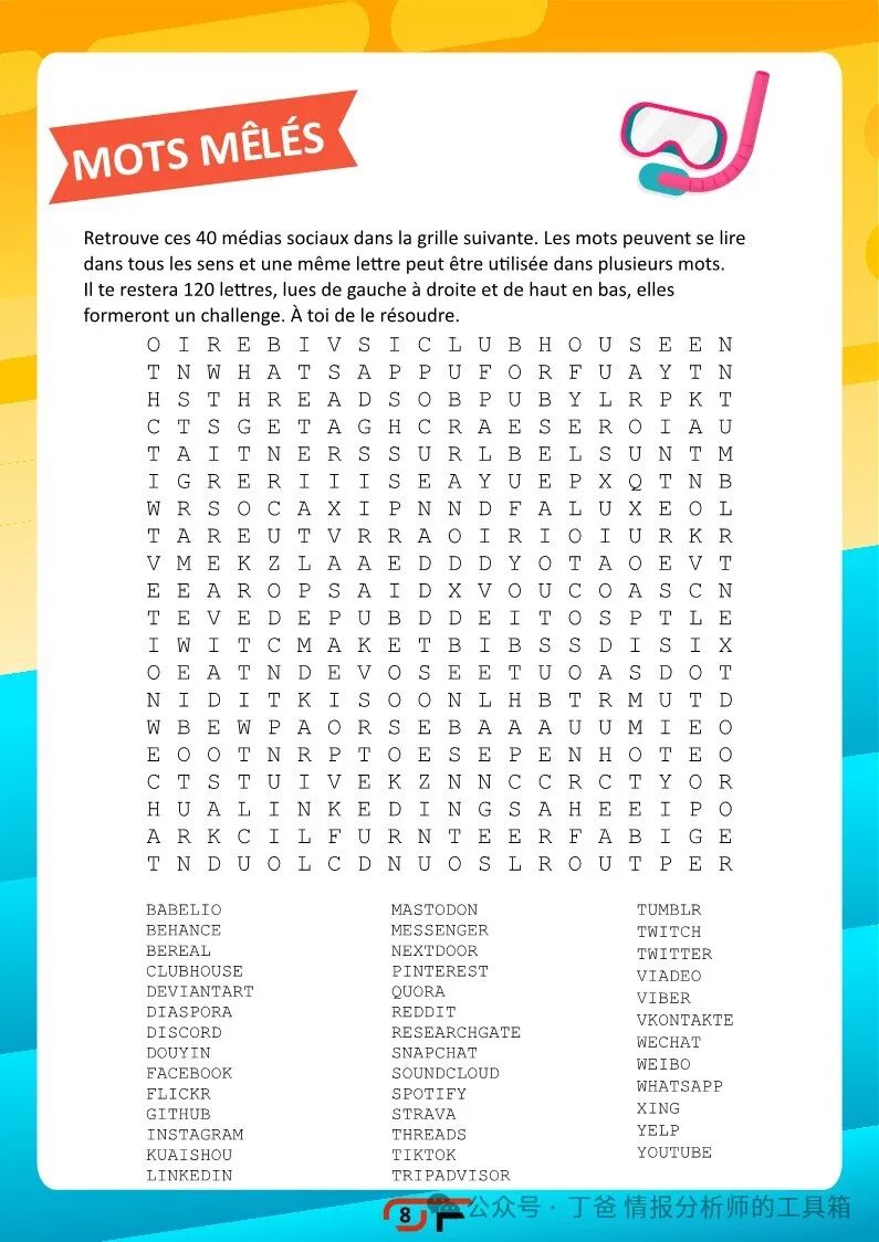 在下面的网格中找到这40个社交媒体。单词可以在任何方向上读,一个空白可以在几个单词中读。你将有120个leres,从左到右,从上到下阅读,它们将构成一个挑战。解决这个问题取决于你。