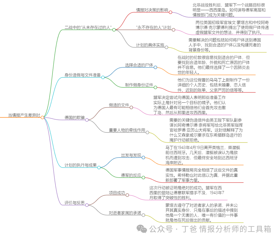 文章描述了二战期间一场极其成功的情报操作——“肉馅行动”计划。通过精心策划和执行,盟军成功地利用一具尸体和伪造的文件欺骗了德国军方,为在西西里岛的成功登陆奠定了基础。这个故事凸显了情报工作的复杂性和重要性,以及在战争中,思维创新和细致策划能够极大地影响战局。