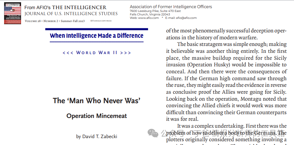 文本摘自《美国情报研究杂志》夏季-秋季2023年刊的一篇文章,讲述了二战期间一场著名的情报操作——“肉馅行动”计划(Operation Mincemeat)。这篇文章是关于英国如何利用一具尸体和虚假文件欺骗德国军方,成功将德军重心引离西西里岛,从而在盟军登陆意大利西西里岛取得战略优势。