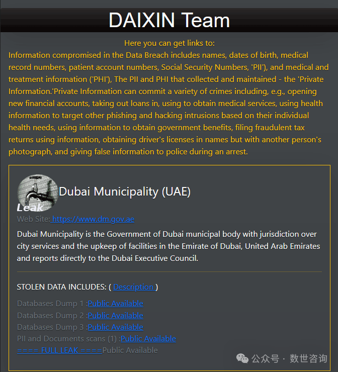 商业黑客组织Daixin在2024.6.5公布了迪拜市政府被勒索的信息。该组织并未按照黑客组织的要求交付赎金,随后Daixin公布了他们获取到的所有数据。