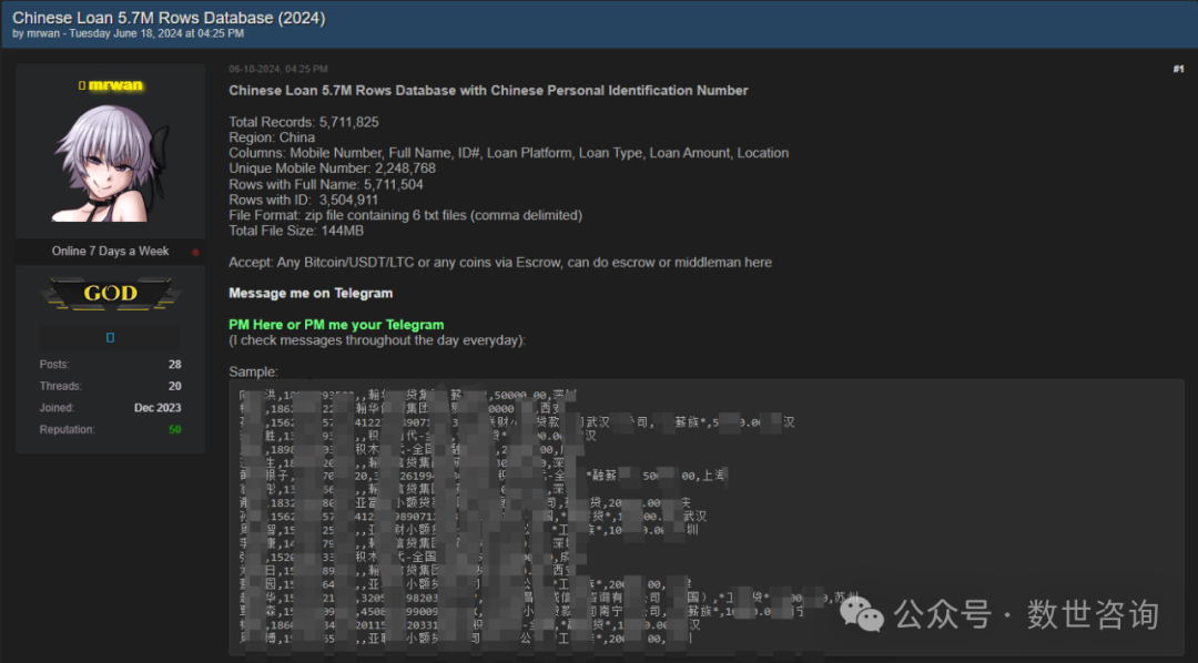 事件描述:2024.6.18某暗网数据交易平台有人宣称正在售卖一份中国公民贷款数据。卖家称此份数据的字段有:手机号码、全名、ID号、贷款平台、贷款类型、贷款金额、位置。其中包括唯一手机号码:2,248,768条,具有完整名称的行:5,711,504条,有ID的行:35,04,911条。卖家称此份数据共有6个txt,总大小为144MB,该份数据的价格卖家并未提及。