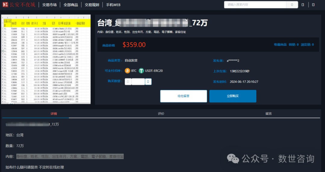 事件描述:2024.6.17某暗网数据交易平台有人宣称正在售卖一份台湾经济部*********处数据。卖家称此份数据共包含72万条,数据字段有:身份證,姓名,性別,出生年月,方案,電話,電子郵箱,家庭住址。此份数据的价格为359美元。