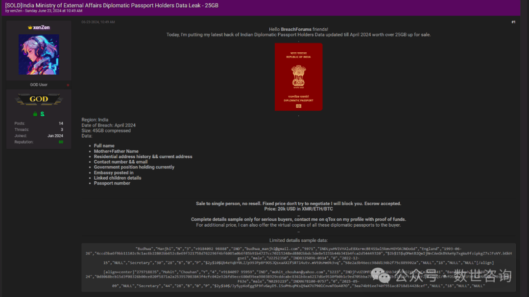 事件描述:2024.6.23某暗网数据交易平台有人宣称正在售卖一份印度外交护照持有者数据。卖家称此份数据获取时间为2024年4月,文件总大小为25GB,解压后为45GB。此份数据包含的字段有:全名母亲、父亲姓名、居住地址历史、当前地址、联系电话、电子邮件、现任政府职位、护照号码。此份数据被卖家标价为20,000美元,一天后2024年6月24日,卖家称此份数据成功被售出。