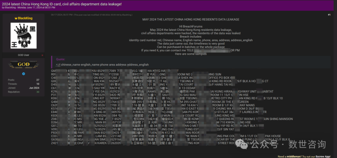事件描述:2024.6.17某暗网数据交易平台有人宣称正在售卖一份香港居民个人信息数据。卖家称此份数据是由香港民政部门泄露出来的,泄露的数据字段有:身份证号码nid,中文姓名,英文姓名,电话,地址。卖家只给出了部分样例,但此份数据的总条数以及价格并未被提及。同时卖家称:数据刚刚泄露,及时性非常好,可批量购买或整包购买,并留下了自己的联系方式。