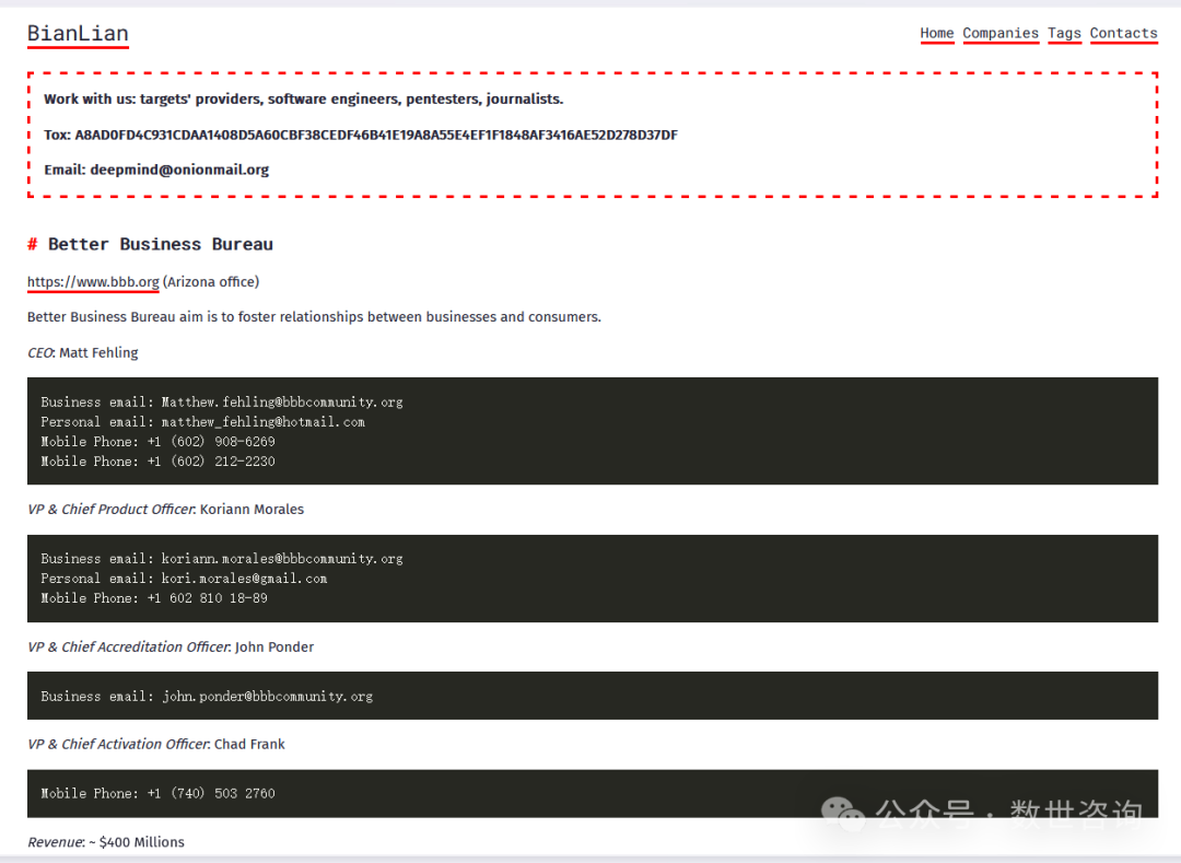 商业黑客组织Bianlian在2024.6.27公布了美国商业改进局被勒索的信息。黑客组织Bianlian正在与该部门进行谈判,截止本篇报告发出之时,Bianlian还并未释放该部门数据。