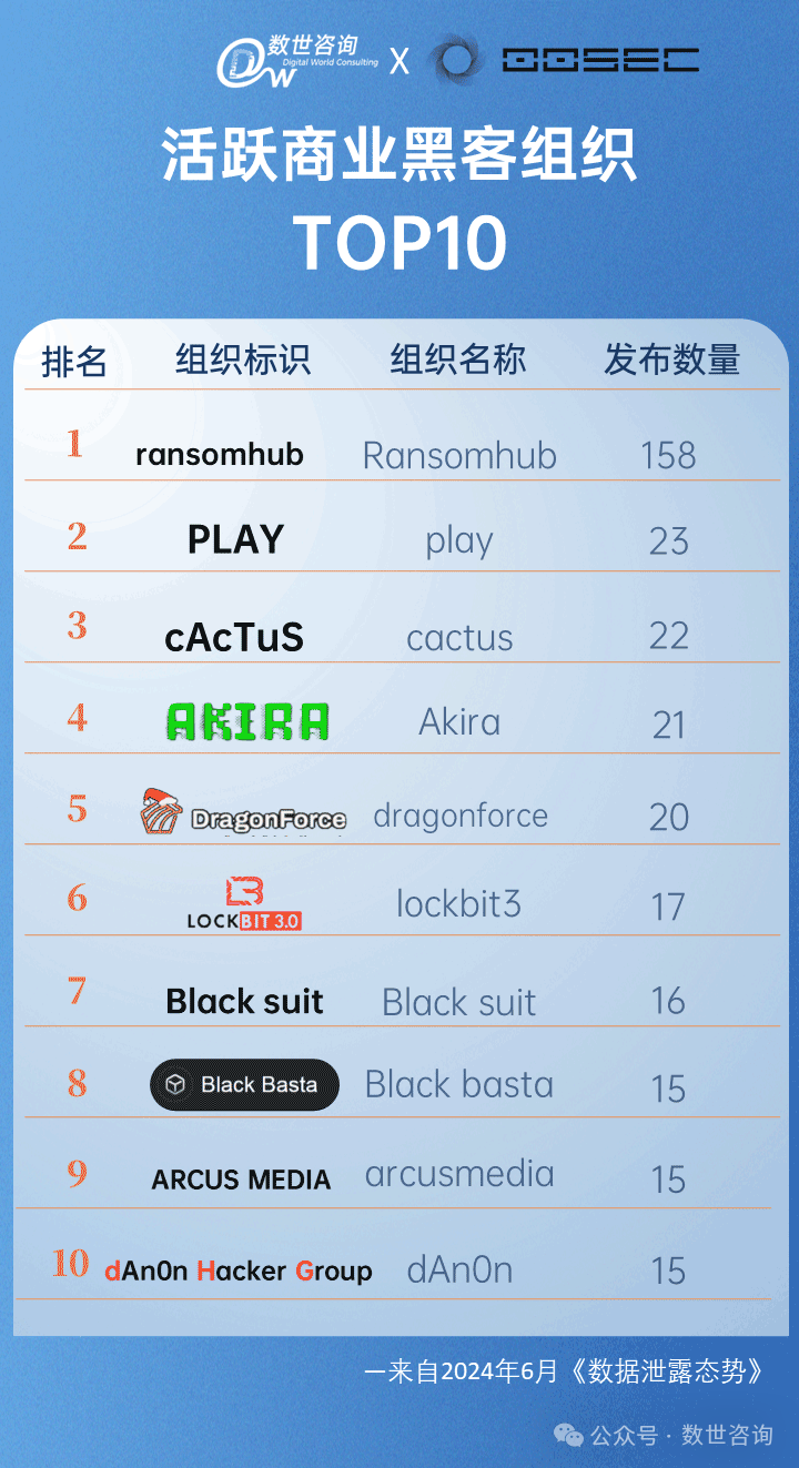 2024年6月全球活跃的商业黑客组织(有勒索发布行为)共34个,公开的勒索事件共435件,TOP 10的黑客组织如下所示: