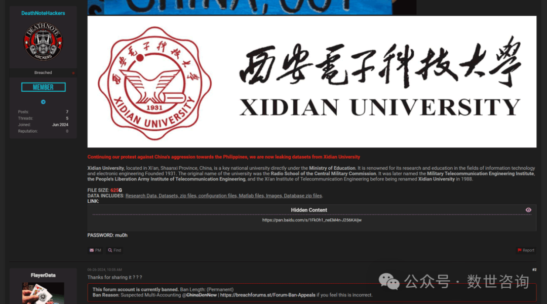 事件描述:2024.6.26某暗网数据交易平台有人宣称正在售卖一份西安电子科技大学数据。发布者宣称“为了继续抗议中国对菲律宾的……我们现在正在泄露西安电子科技大学的数据,数据总量为625GB,包含:研究数据、数据集、zip 文件、配置文件、Matlab 文件、图像、数据库 zip 文件。”对此,我司在进行数据研判时,发现该数据被发布在百度网盘中,发布时间为2020-10-13,并且为实名发布。对该文件集进行检索,发现早在2021年1月4日,互联网上既有关于该文件的咨询。至此判断,该数据泄露发布为【假】。