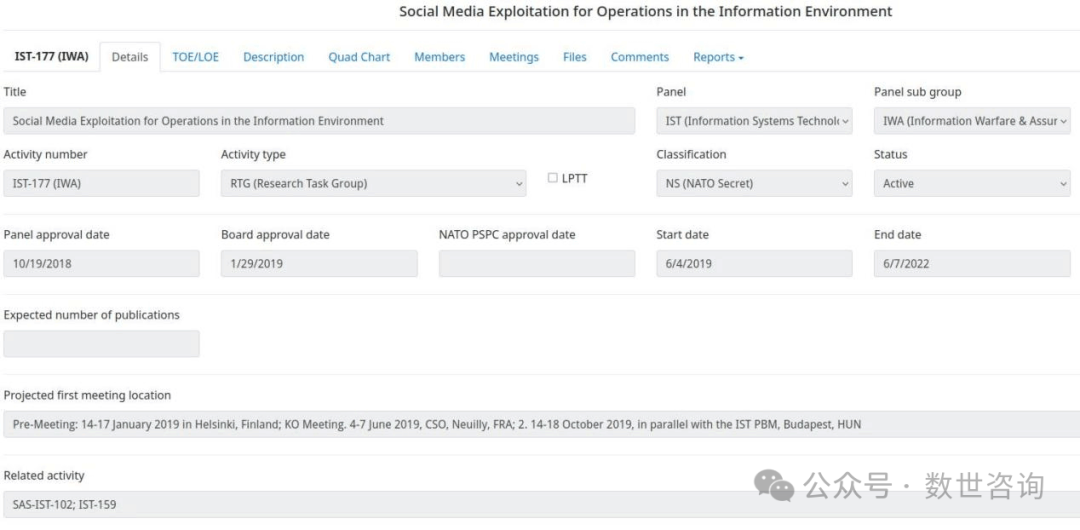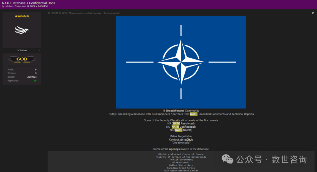 事件描述:2024.6.14某暗网数据交易平台有人宣称正在售卖一份北约数据库和北约机密文件数据。卖家称此份数据包括来自北约的49k成员/合作伙伴,机密文件和技术报告。文件的一些安全分类级别:NR(受北约限制)、NC(北约机密文件)、NS(北约秘书处)等。此份数据的价格卖家并未提及,卖家留下了自己的telegram联系方式以供买家联系。