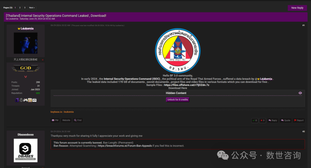事件描述:2024.6.29某暗网数据交易平台有人宣称正在售卖一份泰国内部安全行动指挥部数据。该黑客称此份数据是攻击泰国皇家武装部队的政治部门国内安全行动指挥部(ISOC)得来的,此份数据总大小为178 GB,其中包含许多机密文件、项目文件和各种格式的视频文件。