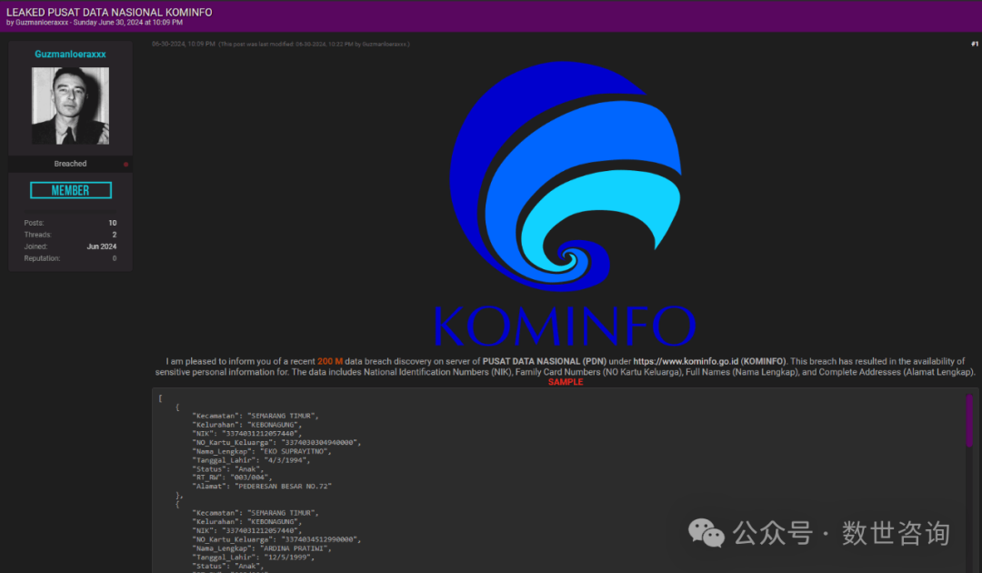 事件描述:2024.6.30某暗网数据交易平台有人宣称正在售卖一份印度尼西亚通信和信息技术部数据。卖家称此份数据来自PUSAT DATA NASIONAL (PDN)印尼国家数据中心,此份数据共计200,000,000条,泄露的字段有:国民身份证号码(NIK)、家庭卡号码(NOKaruKeluarga)、全名(NamaLengkap)和完整地址(AlamatLengkap)。此份数据的价格卖家并未提及,更多样例与价格需要与卖家进行联系获取。