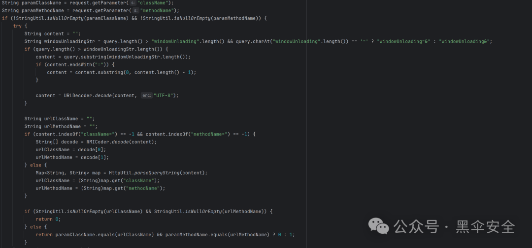 Smartbi 新增了 WindowUnLoadingAndAttributeRule 规则来修补这个漏洞,它会先判断请求中是否存在 windowUnloading 参数,接着判断请求中是否存在 className 和 methodName 等参数,如果存在,则判断二者解析出来后是否相同。