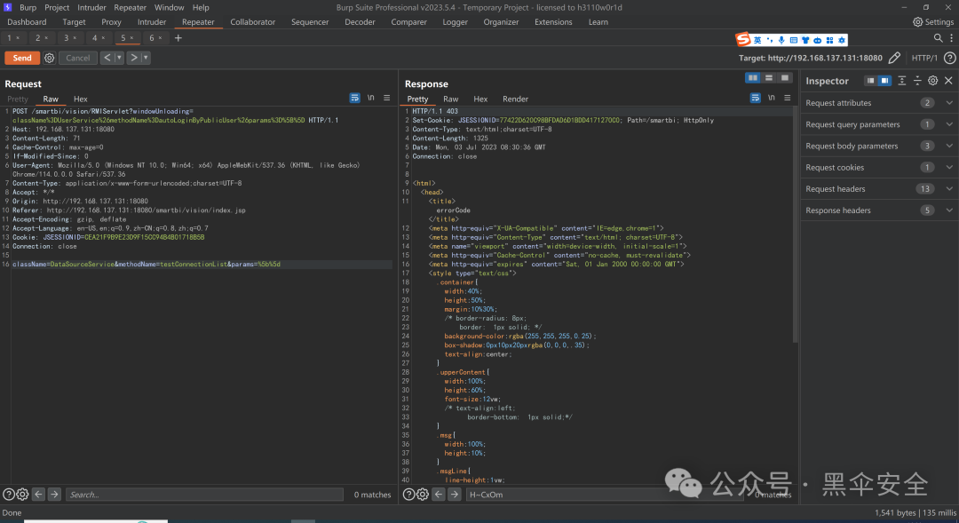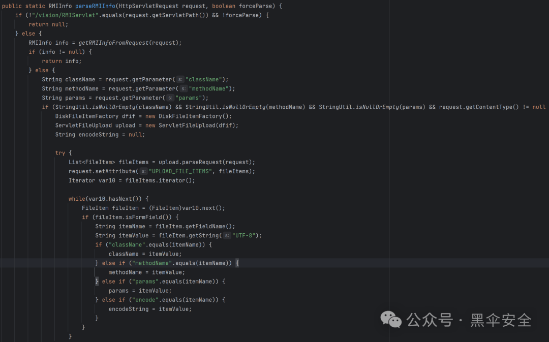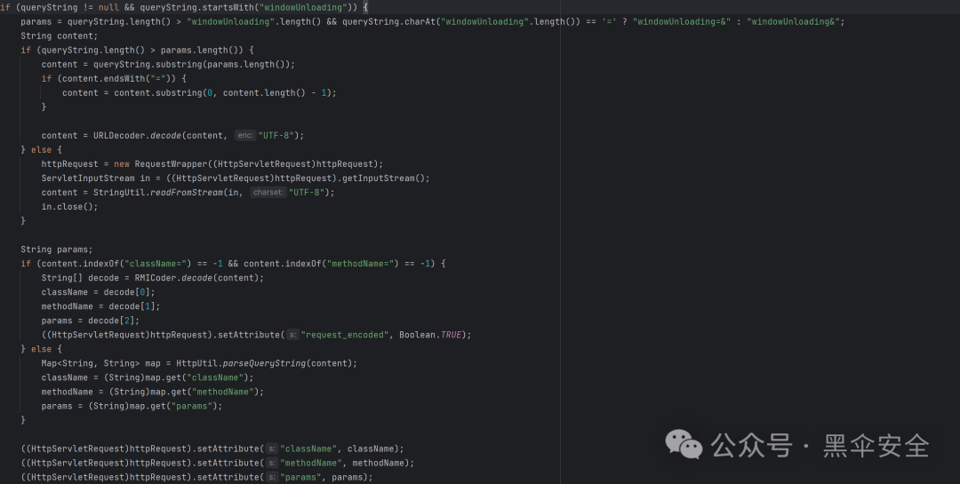 从解析流程中不难看出这里存在一个差异绕过的问题,第一步使用 windowUnloading 对参数进行设置,同时在请求的参数里也进行设置,那么在 CheckIsLoggedFilter 里拿到的就是 windowUnloading 里的参数,而 RMIServlet 拿到的却是请求里的参数。