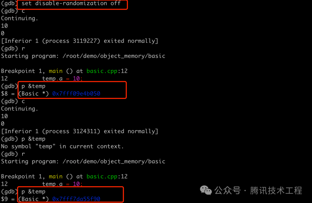 前面的例子中,如果用 GDB 多次运行程序,对象的虚拟内存地址每次都一样,这是为什么呢?