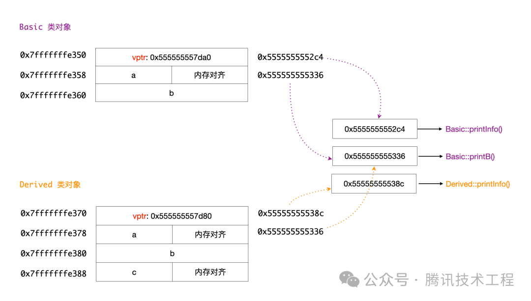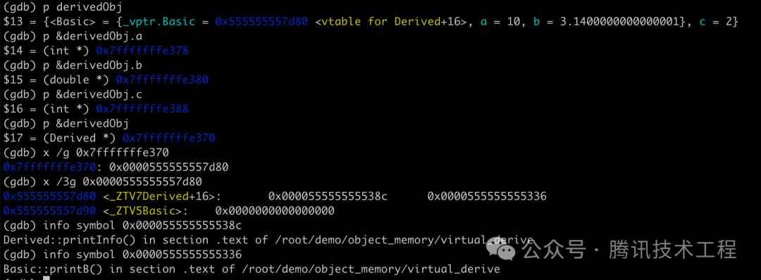 那么在有虚函数继承的情况下,对象的内存布局是什么样?虚函数的多态调用又是怎么实现的呢?实践出真知,我们可以通过 GDB 来查看对象的内存布局,在此基础上可以验证虚函数表指针,虚函数表以及多态调用的实现细节。这里先看下 Derived 类对象的内存布局,如下图: