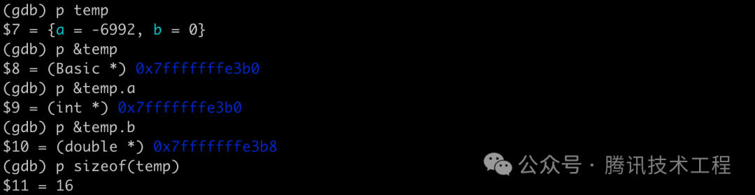 ,表明 int a 是对象 temp 中的第一个成员,位于对象的起始位置。成员变量 b 的类型为 double,其地址是 0x7fffffffe3b8