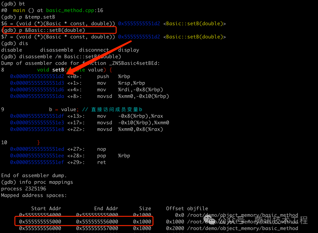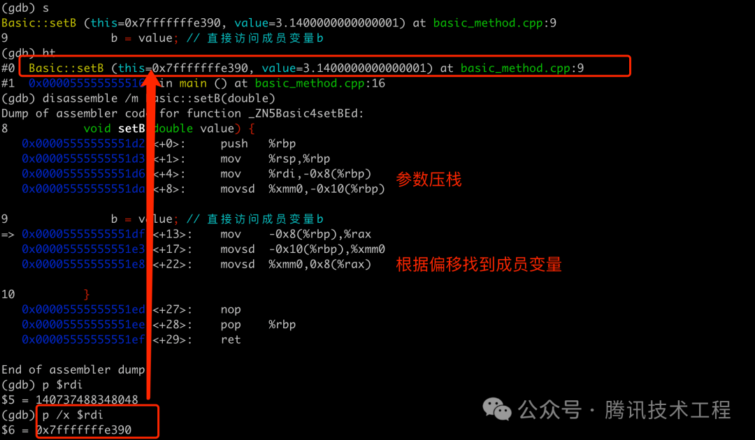 **这里参数传递了对象的地址,但是在函数里面是怎么拿到成员变量 b 的地址呢?**我们在调用 setB 的地方打断点,执行到断点后,用 step 进入到函数,然后查看相应寄存器的值和汇编代码。整个过程如下图: