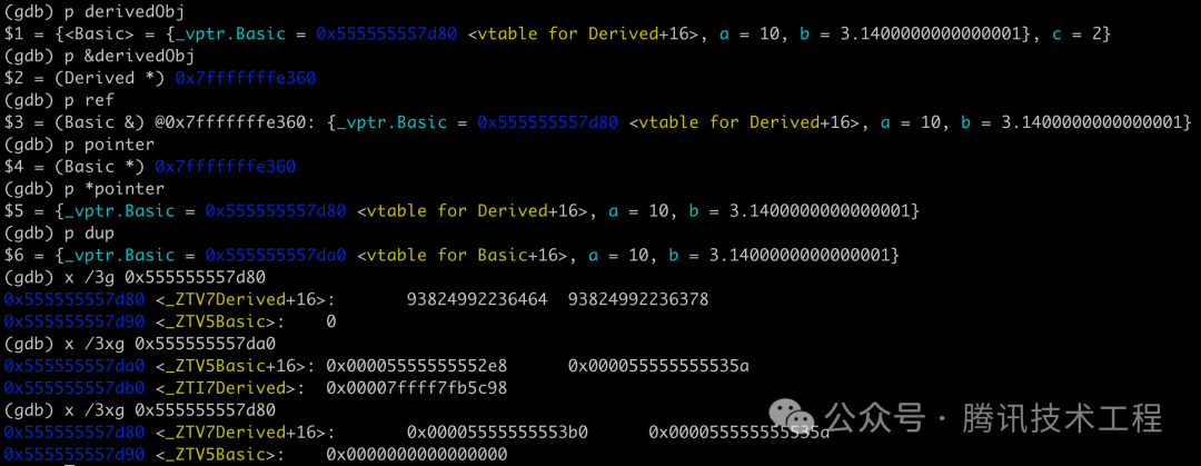 编译运行后,用 GDB 打印成员变量的内存分布,发现 Derived
