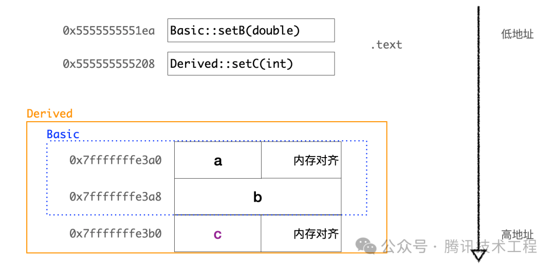 的所有成员变量,紧接着是 Derived 类自己的成员变量。整体布局如下图: