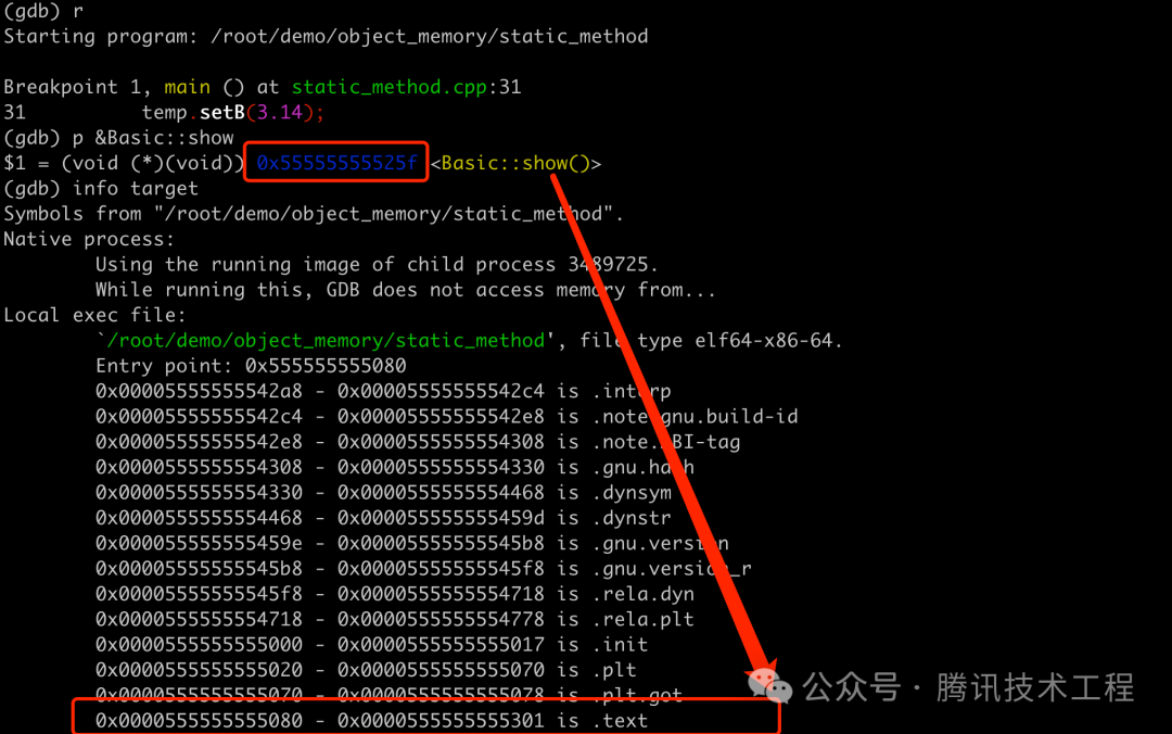 可以在 GDB 里面打印下成员方法的地址,如下图所示。