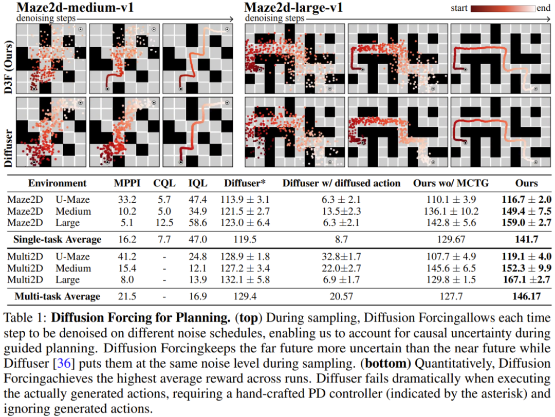 表 1 给出了定性和定量的评估结果。可以看到,扩散强制在全部 6 个环境中都优于 Diffuser 和所有基准。