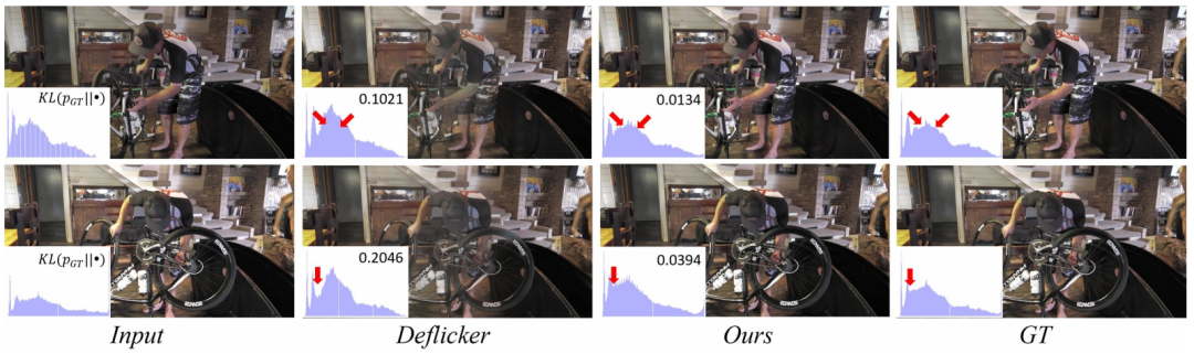 受经典的闪烁去除方法尺度时间均衡 (scale-time equalization, STE) 的启发,BlazeBVD 引入了直方图辅助解决方案。图像直方图被定义为像素值的分布,它被广泛应用于图像处理,以调整图像的亮度或对比度,给定任意视频,STE 可以通过使用高斯滤波平滑直方图,并使用直方图均衡化校正每帧中的像素值,从而提高视频的视觉稳定性。虽然 STE 只对一些轻微的闪烁有效,但它验证了: