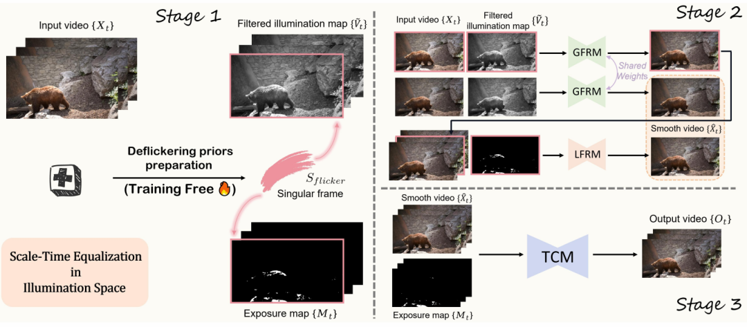 其次,由于滤波后的照明映射具有稳定的时间性能,它们将被用作包含 2D 网络的全局闪烁去除模块 (GFRM) 的提示条件,以指导视频帧的颜色校正。另一方面,局部闪烁去除模块 (LFRM) 基于光流信息来恢复局部曝光图标记的过曝或过暗区域。
