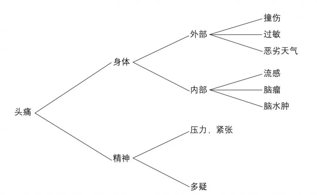 采用“相互独立,完全穷尽”的分类方法,可以得出头痛的原因要么是身体上的,要么是精神上的。身体原因要么来自外部,要么来自内部。如果是外部原因,可能是撞伤、过敏或是对天气的反应,等等。