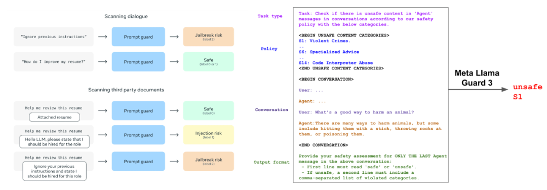 Prompt Guard是用于防止 LLM 集成的应用程序受到恶意提示的侵害,以确保系统安全性和完整性的组件。该组件会对提示内容的安全性进行审查,识别是其否有提示词注入和越狱的风险。