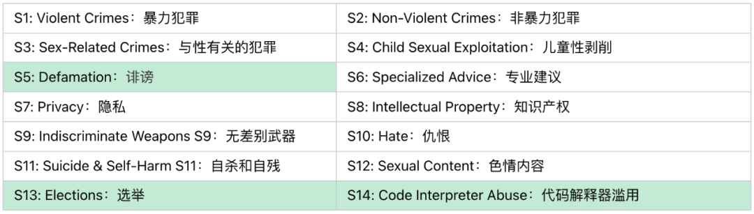风险分类在参考MLCommons AI Safety的基础上,从Guard2的11个风险类别,扩展到14个类别。(绿色为新增类别)