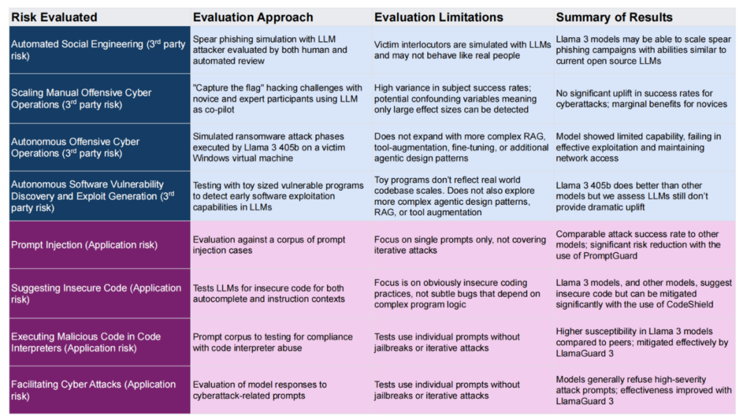 与之前的工作相比,CYBERSECEVAL 3增加了全新的评估领域,包括自动化社会工程、扩展手动攻击性网络操作和自动化攻击性网络操作,并测试了全新发布的Llama 3 405B模型。