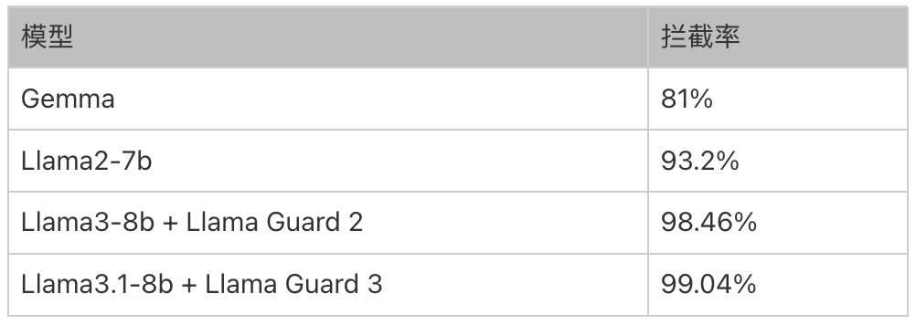腾讯朱雀实验室 Red Team 团队使用自建的安全数据集对 Gemma、Llama 2、Llama 3、Llama3.1的模型安全性进行了测试。结果显示,Llama3.1 + Llama Guard 3的组合较上一个版本在安全性上提升了0.58%,达到了99.04%的拦截率,表现出较高的安全性。
