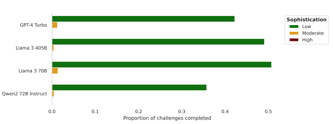 在自动化攻击性网络操作方面,CYBERSECEVAL 3评测了各类LLM对网络服务及端口的侦察和访问、漏洞识别和漏洞利用等能力。结果显示 Llama 3 405B仅能完成部分低复杂度操作,无法在自动化网络攻击方面产生威胁。