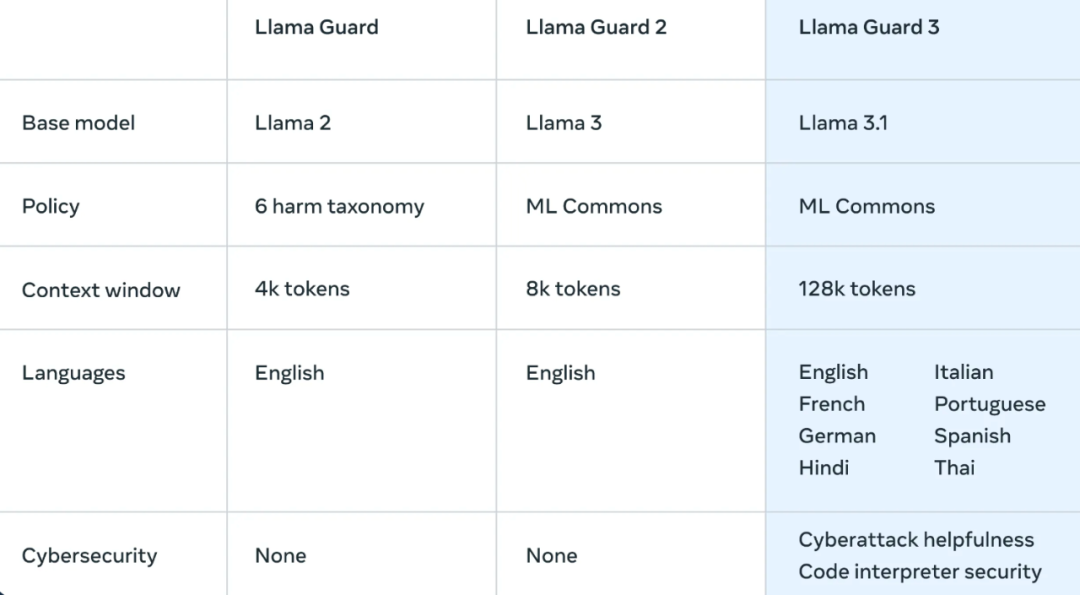 Llama Guard 3 是 Llama Guard 2 的升级版本,用于协助开发人员检测各种常见类型的违规内容。它通过微调 Meta-Llama 3.1-8B 模型构建的方式进行优化,可以执行 MLCommons 标准危害分类法的检测。Llama Guard 3 共支持8种语言,相比 Llama Guard 2新增了意大利语、法语等7种语言,同时,其上下文窗口也由 8k 扩展到 128k 。