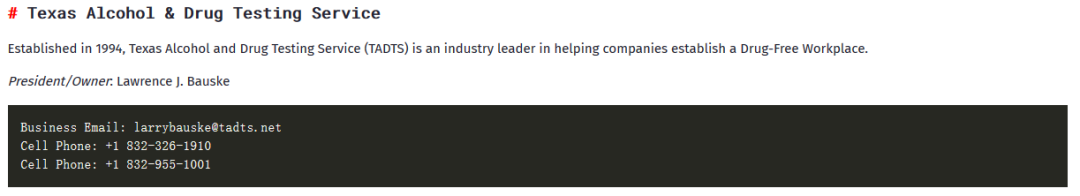 BianLian团伙在其位于暗网的数据泄露站点公布了新的受害公司来自美国德克萨斯州的Texas Alcohol & Drug Testing Service,据悉该公司成立于1994年,是一家提供工作场所检测和个人检测服务的药物检测公司: