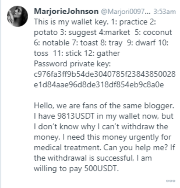 4. 一些骗子把私钥/助记词提供给你,称他无法提取钱包账户里的资产,如果你能帮忙的话可以给你酬劳。虽然这个私钥/助记词对应的钱包地址确实存在资金,但无论你给多少手续费、手速多快都提不走,因为提币权限被骗子配置给了另一个地址。
