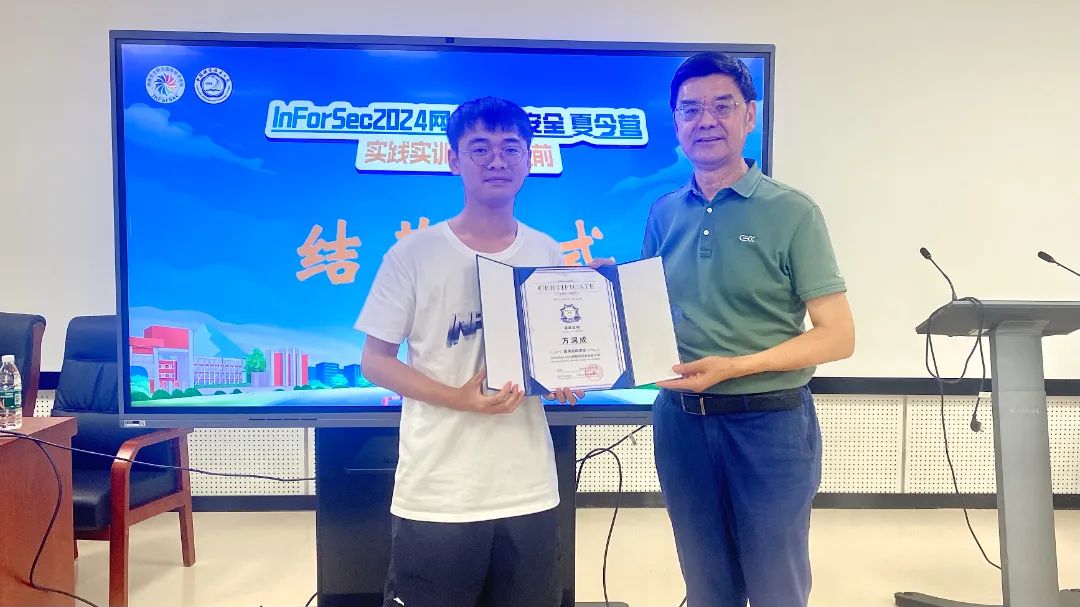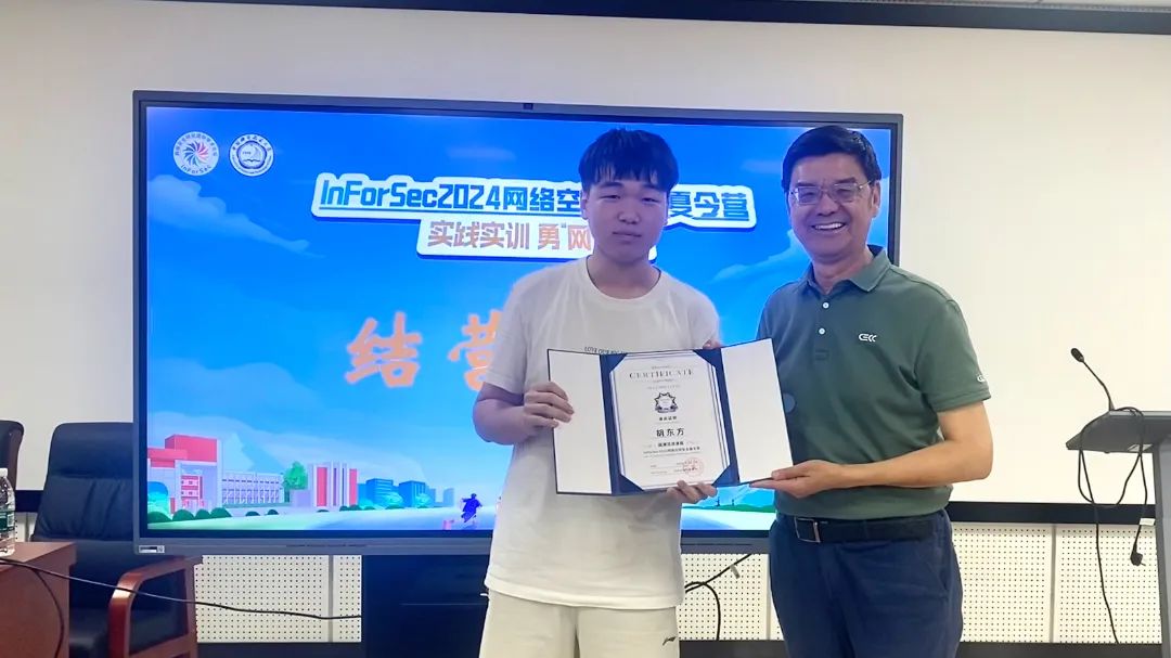 俞能海院长首先对前来参加夏令营的各大高校优秀学子表示热烈欢迎,俞能海院长表示,高校是培养网络安全人才的重要基地,高校正在与企业、科研机构联手,强化人才培养,为网络安全事业不断注入动力,也希望同学们在校园里能够努力学习,俞能海院长鼓励学员在“求学”这个重要的人生阶段里,努力填写好这部分的“人生履历表”,向难而行,抓住一切机会,充实自己、提升自己,坚定理想信念。最后,俞能海院长为夏令营学员颁发了结业证书,预祝他们未来在网络安全领域有更大的发展。