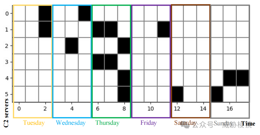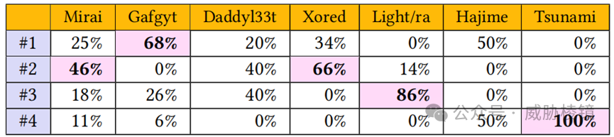 聚类也可以很好地表征恶意软件家族的行为,但并不完美。大多数 Mirai 的样本模式为 CLIENT_4.CLIENT_1.CLIENT_2.SERVER_2,大多数 Gafgyt 的样本模式为 SERVER_4.SERVER_1.SERVER_4.SERVER_1,这二者就覆盖率 68% 的 C&C 通信。