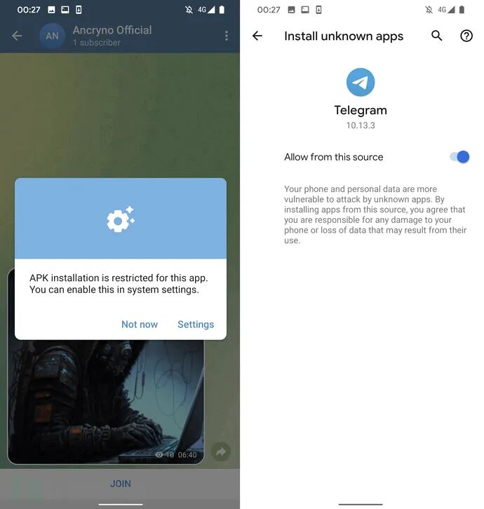 用户可以选择取消或尝试打开文件。但如果用户选择“打开”,他们还需要允许Telegram应用程序安装Android应用程序包(APK)。在安装之前,Telegram会要求用户启用未知应用程序的安装。因此,用户需要执行一系列操作才能激活恶意载荷,但伪装的文件和Telegram的错误分类仍然引起了明显的安全担忧。