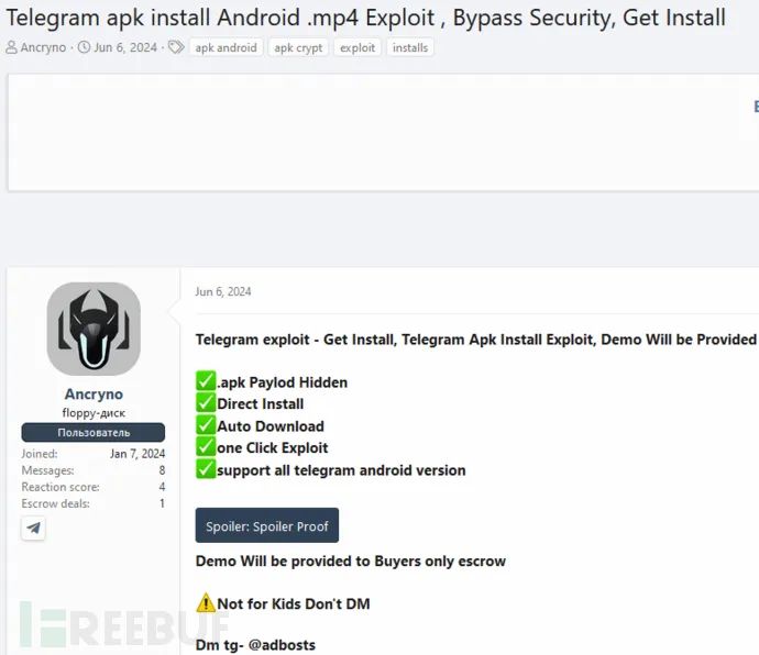 ESET Research在一个地下论坛上发现了一个针对Android Telegram的零日漏洞广告。