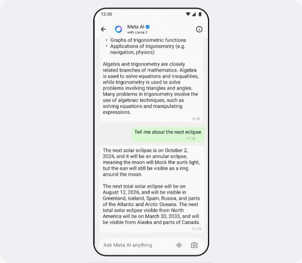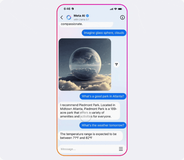 Llama 3.1 现在为 Meta AI 提供支持,Meta AI 是 Meta 应用程序和雷朋智能眼镜中提供的 AI 助手,它被定位为像 ChatGPT 这样的通用聊天机器人,几乎可以在 Instagram、Facebook 和 WhatsApp 的任何地方找到。