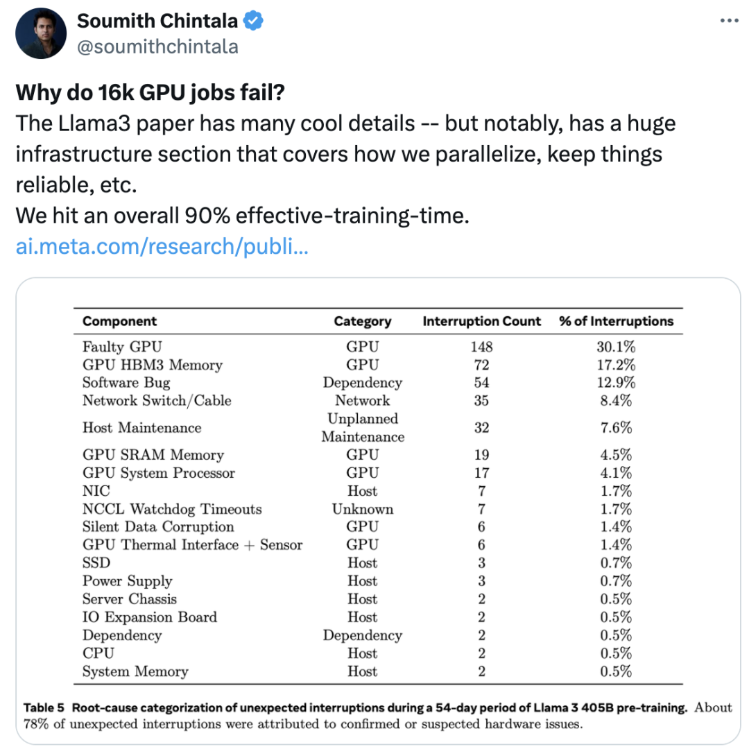 深度学习框架 PyTorch 的联合创始人、Facebook AI Research (FAIR) 的研究员 Soumith Chintala 发推称 Meta 调度 1.6 万 H100 GPU 算力集群的有效训练时间达到 90%。|图片来源:X.com