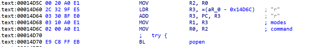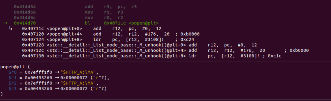 gadget我们选择0x14d5c这个gadget,这里利用popen来进行命令执行,debug到这个位置我们可以看见r0正好指向的时0x7efff1f0也就是get指针前的位置,因此我们在这里加入$HTTP_A环境变量来实现命令执行。