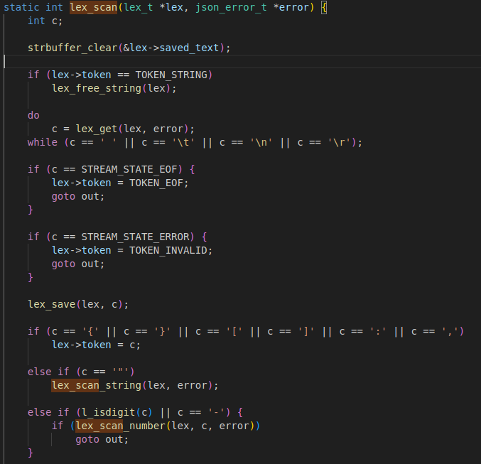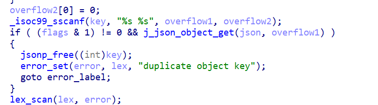 因为libjansson是一个开源的项目,直接在github上面搜索我们就可以找到对应的源码(需要注意的是,这里源码和题目中lib并不是完全相同,题目的libjansson.so.4.7.0再次基础上进行了修改因此造成了漏洞,所以我们看这个源码只是方便逆向),通过漏洞描述以及开源代码中的内容,我们确定代码的漏洞点就触发在parse_object函数中,ida在形成伪代码过程中并没有识别出parse_object,因此我们可以通过字符串“string or '}' expected”最终定位到这个函数的位置,最终形成漏洞的点就在sscanf这里,他对于overflow1和2并没有检查长度。