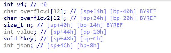 综上目前已经知道了对于漏洞触发的位置,接下来就是要探究如何根据这个漏洞进行利用,首先就是需要关注的,因为我们需要对于overflow1进行溢出,但是如果想要溢出到返回地址,就需要覆盖key,json等值,这样在之后的释放时会出现程序终止,因此这样行不通。