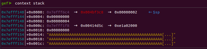 之后我们就需要确定一下具体的偏移,首先根据gdb按照上面的步骤进行debug,可以看到最终执行到bl 0x76fb45f8时,r0指向的地址为0x7efff1f8。