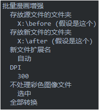 CEP即老马工具ComicEnhancerPro,小巧、绿色。打开CEP,缺省自动弹出参数调整界面,若未弹出,Ctrl-A打开,Ctrl-P关闭,或者点选"查看-参数栏"。打开X:\before目录下某张图片,点选"查看-适合宽度"。在参数界面调整各种参数,所见即所得,直至当前图片显示效果满足需求。这个没法教,好在一试便知,只要肉眼效果可接受即可。比如这是我用过的一组参数: